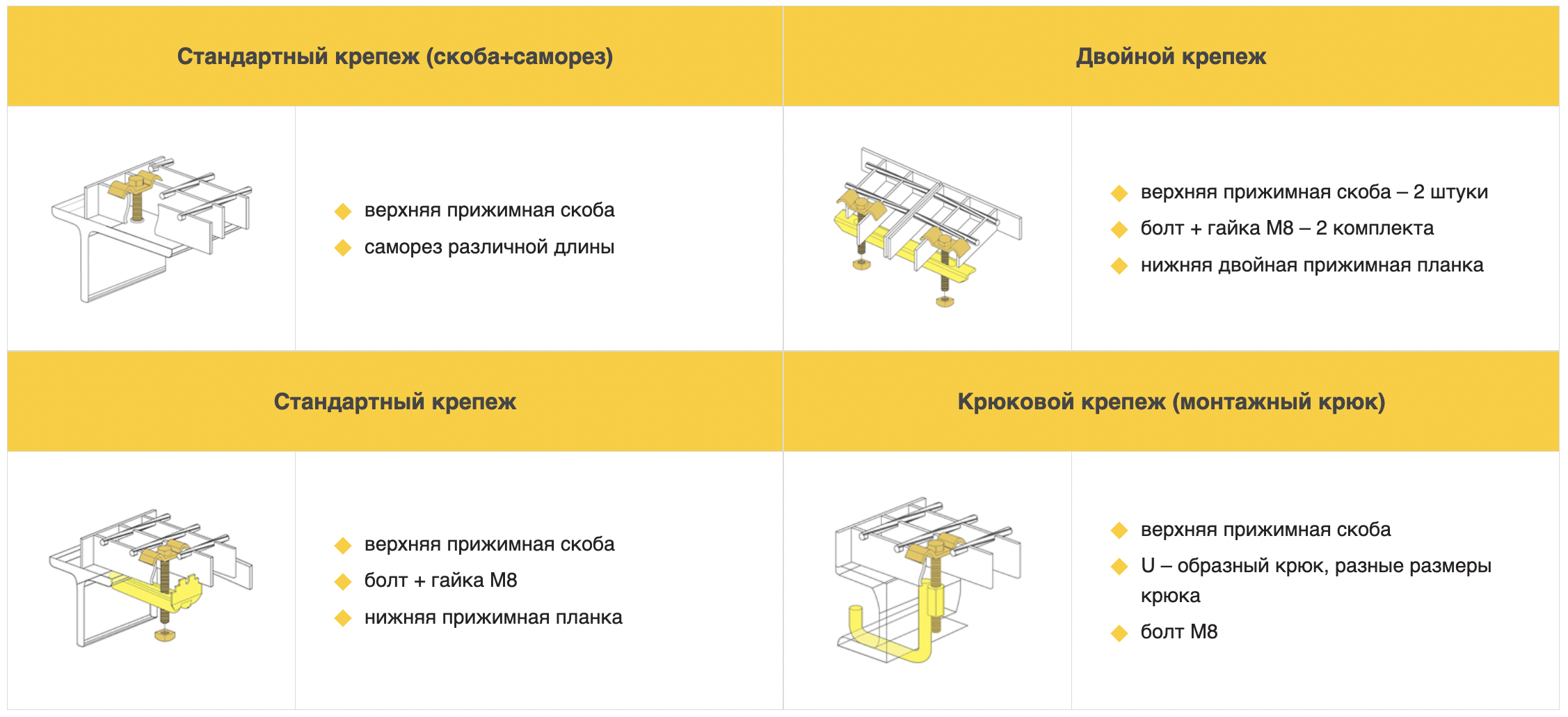 - "Двойной зажим" - состоит из 2х штук верхних прижимных скоб (может быть двух видов - широкая и узкая), двух комплектов болтов М8*60мм и гайек и одной нижней общей прижимной планки. К достоинством данного вида крепления можно отнести - возможность скрепления настилов между собой, обеспечивая неподвижную однородную поверхность.