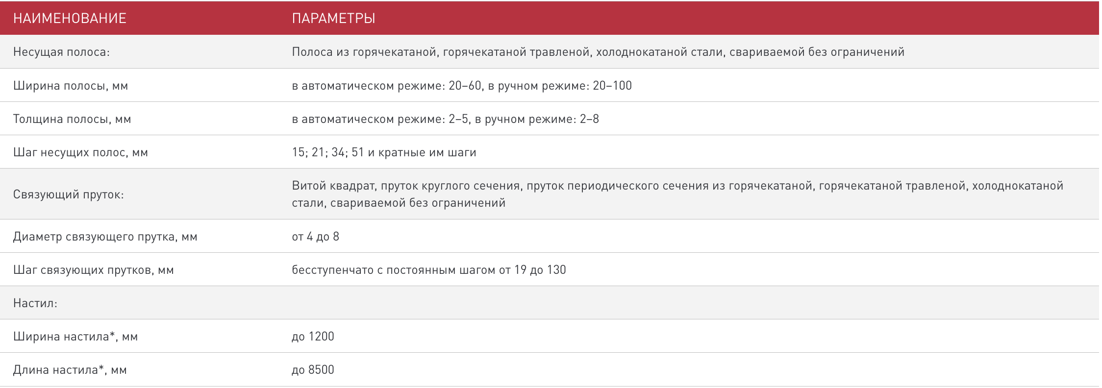 | Диаметр связующих прутков | 4–8 мм |
